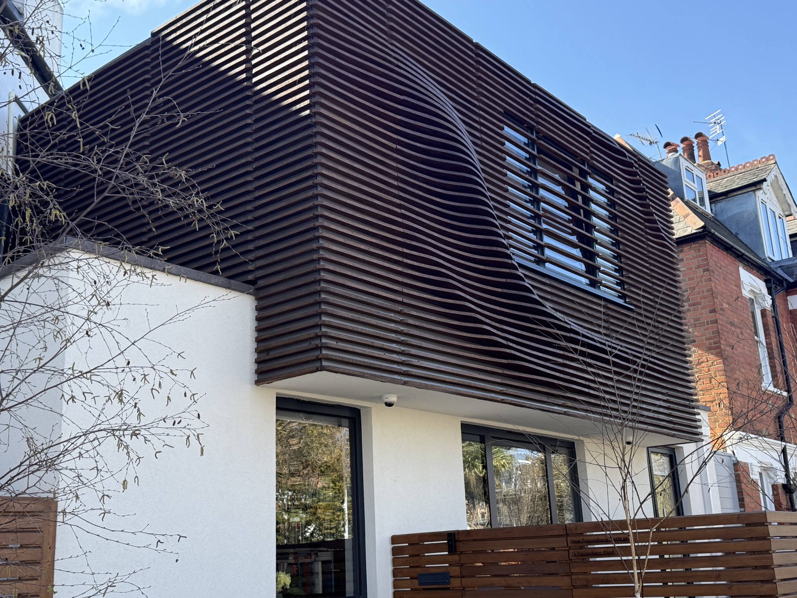 Our client Marc was purchasing New Fauconberg Cottage, a detached home on Fauconberg Road in Chiswick's Grove Park, a short walk from the Thames and Chiswick House. This isn't your typical property. It was designed by Torsten Bröder, a senior architect at Zaha Hadid Architects (the practice behind the London 2012 Aquatics Centre and the Serpentine Gallery extension, among others), and built by Bröder and his partner Simon Gentry over a period of four years. The house has featured in Open House London and is locally recognised for its distinctive sculptural timber louvre cladding.